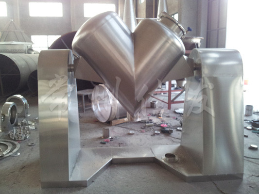 該機(jī)通過(guò)機(jī)械傳動(dòng),使不對(duì)稱的V型圓柱體內(nèi)的物料做往復(fù)翻動(dòng),達(dá)到均勻混合之目的。