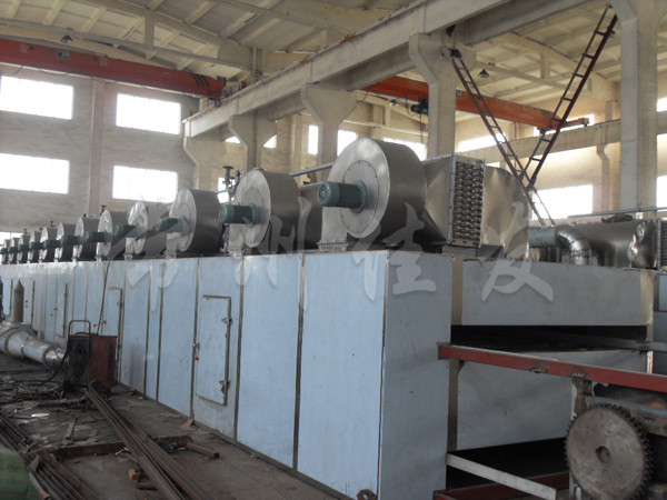 物料由加料器均勻地鋪在網(wǎng)帶上,網(wǎng)帶一般采用12-60目不銹鋼絲網(wǎng),由傳動裝置拖動在干燥機內(nèi)移動。干燥機由若干單元組成,每一單元熱風獨立循環(huán),部分尾氣由專門濕風機排出,廢氣由調(diào)節(jié)閥控制,熱氣由下往上或由上往下穿過鋪滿物料的網(wǎng)帶完成熱量與質(zhì)量傳遞的進程,帶走物料的水份。網(wǎng)帶緩慢移動,運行速度可根據(jù)物料溫度自動調(diào)節(jié),干燥后的成品連續(xù)落入收料器中。上下循環(huán)單元根據(jù)用戶需要可靈活配備,單元數(shù)量亦可根據(jù)需要選取。
