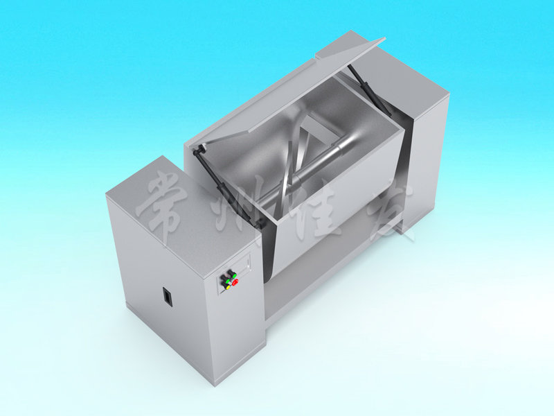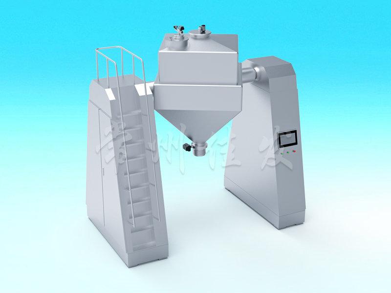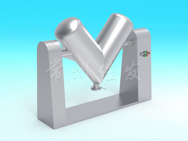 該機通過機械傳動,使不對稱的V型圓柱體內(nèi)的物料做往復翻動,達到均勻混合之目的。